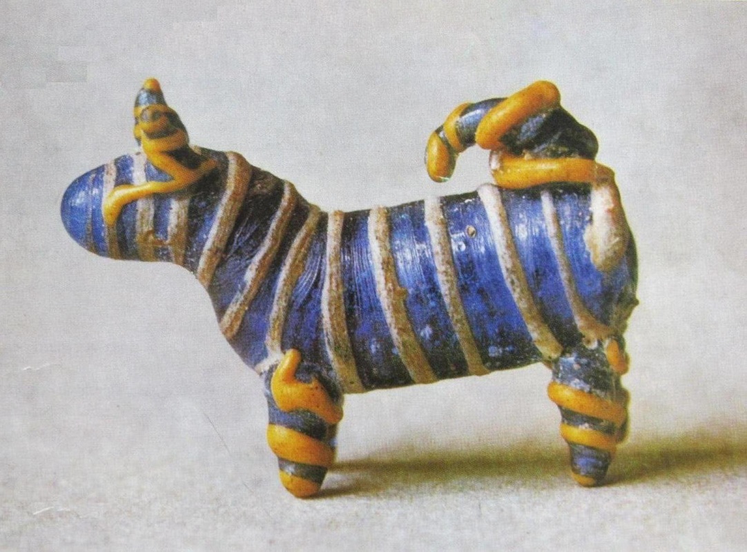 Jinak je tomu s malými plastikami pejsků z hrobů na území na západ od Šumavy, okolo soutoku Rýna s Mohanem. Bývají z bronzu, keramiky ale ta nejhezčí je tříbarevného modrého, bílého a žlutého skla (Wallertheim).Tam bývaly –překvapivě- ukládány do hrobů malých holčiček. Symbolicky? Měli je v keltském záhrobí chránit?